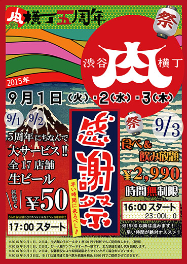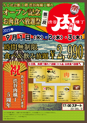 弊社にて管理、コンサルタント業務を行う「渋谷肉横丁」にて5周年イベントが開催されます。